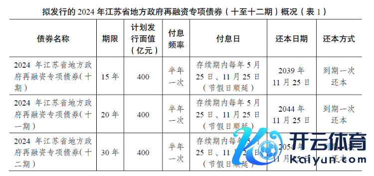 11月15日,江苏省在中国债券信息网潜入的文献通晓,其拟于11月22日刊行1200亿元再融资专项债券置换存量隐性债务,15年期、20年期、30年期再融资专项债券测度刊行面值均为400亿元,品种为记账式固定利率附息债券。
