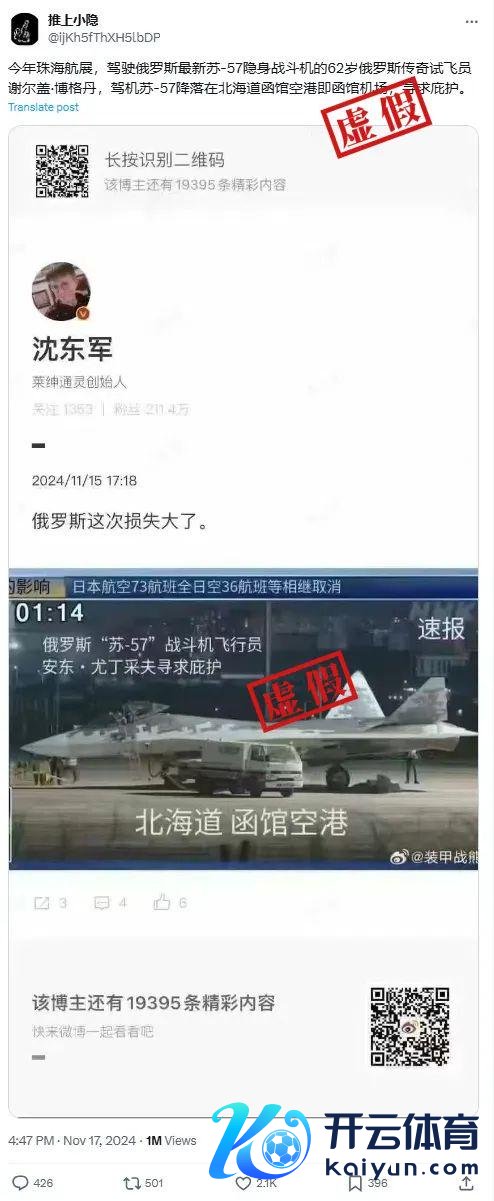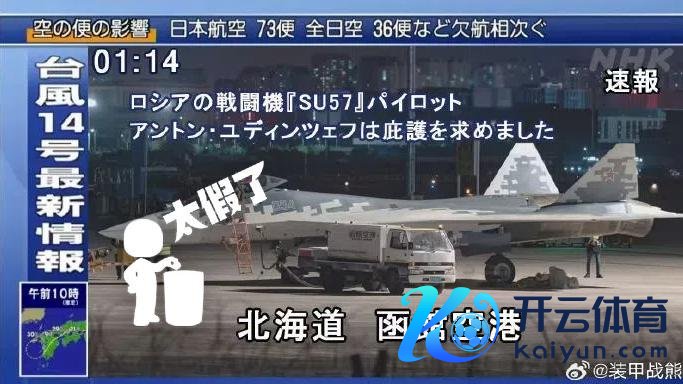 一条在X平台上点击量过百万的推文声称,“在本年的珠海航展中,驾驶俄罗斯最新苏-57隐身战争机的62岁俄罗斯传奇试飞员谢尔盖·博格丹降落在日本北海谈函馆空港,寻求坦护。”
