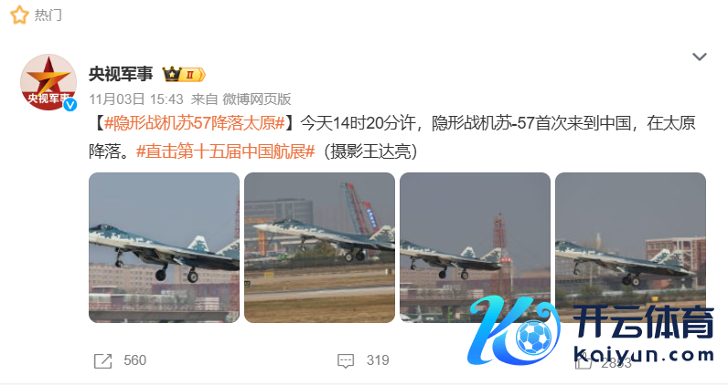 2024年11月3日,“央视军事”官方微博发布音问称:“今天14时20分许,隐形战机苏-57初次来到中国,在太原降落。”