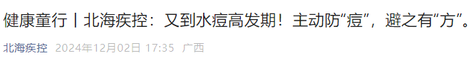 ▪ 12月2日,北海疾控发布了健康教导:每年11月至次年1月是水痘好发期!主动防“痘”,避之有“方”。