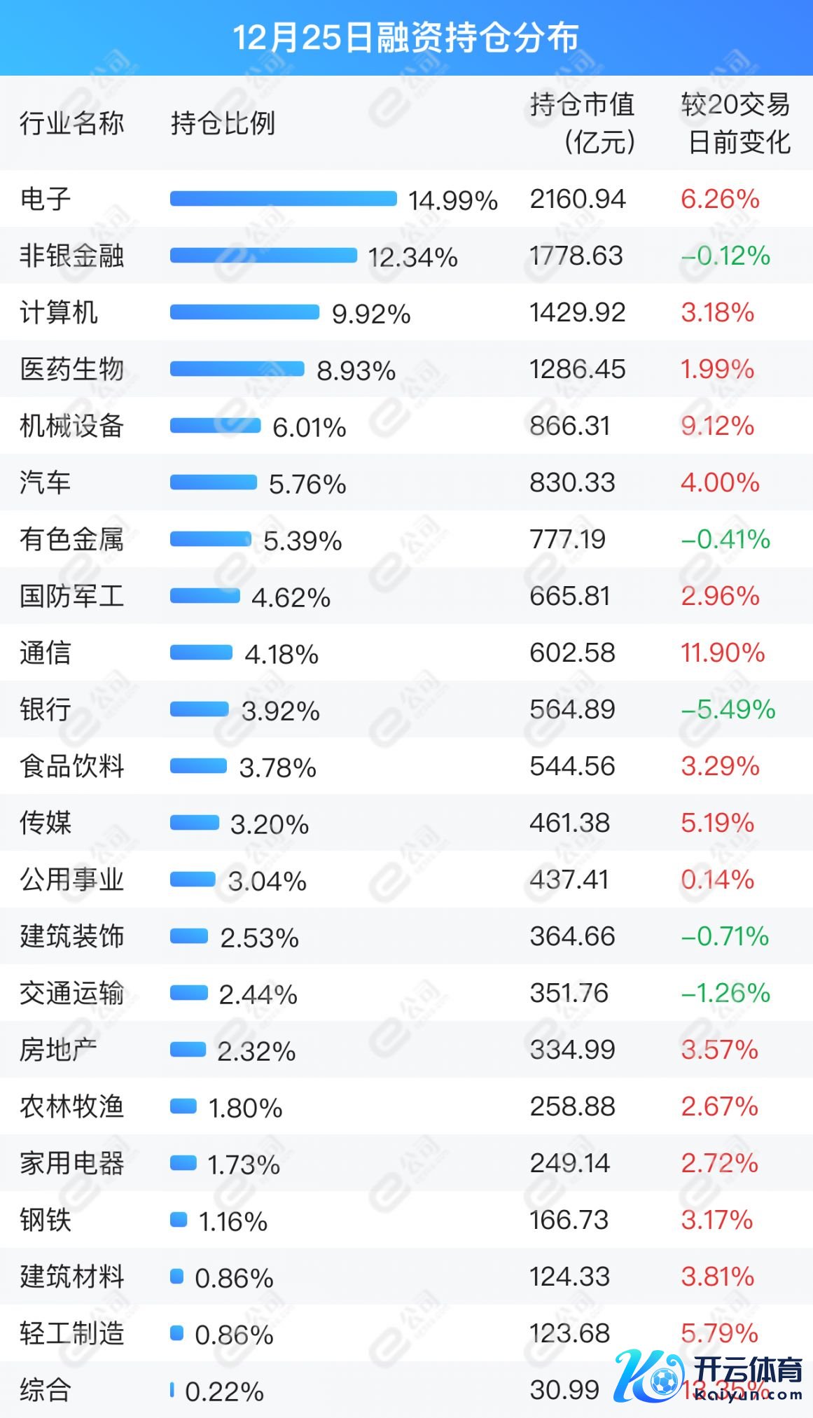 e公司数据统计透露,纵脱12月25日,融资捏仓市值前五行业为电子、非银金融、绸缪机、医药生物、机械建立,占捏仓总市值52.2%。