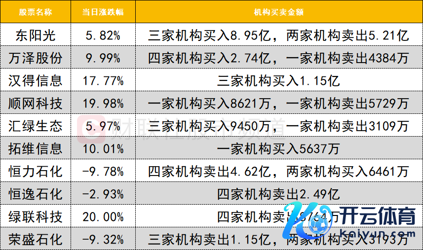 本日龙虎榜机构活跃度一般,买入方面,万泽股份走出2连板,获四家机构买入2.74亿,同期遭一家机构卖出4384万。恒逸石化本日冲高回落,遭四家机构卖出2.49亿。东阳光冲板回落,获三家机构买入8.95亿,同期遭两家机构卖出5.21亿。