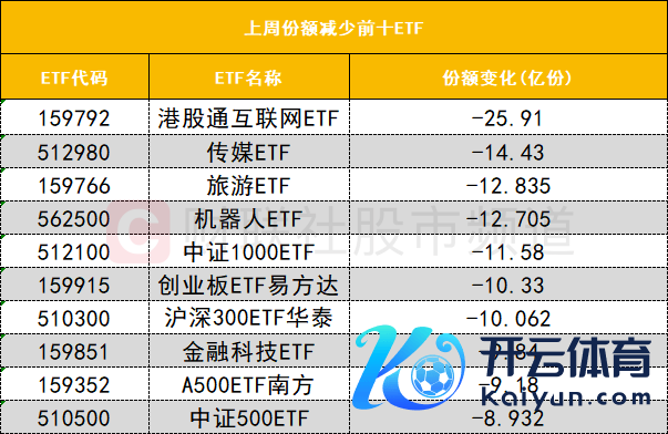 在上周份额减少前十的ETF中,港股通互联网ETF(159792)上周份额减少25.91亿份位居首位。