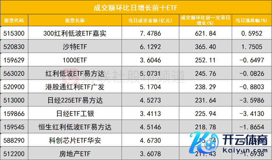 从成交额环比增长前十的ETF来看,300红利低波ETF嘉实(515300)成交额环比增长621%位居首位;沙特ETF(520830)成交额环比增长365%位居次席。