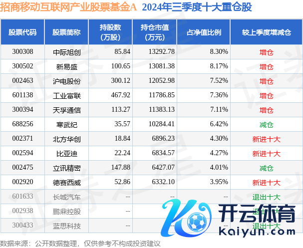 招商出动互联网产业股票基金A为股票型基金,笔据最新一期基金季报表露,该基金金钱建立:股票占净值比92.9%,债券占净值比4.26%,现款占净值比4.69%。基金十大重仓股如下: