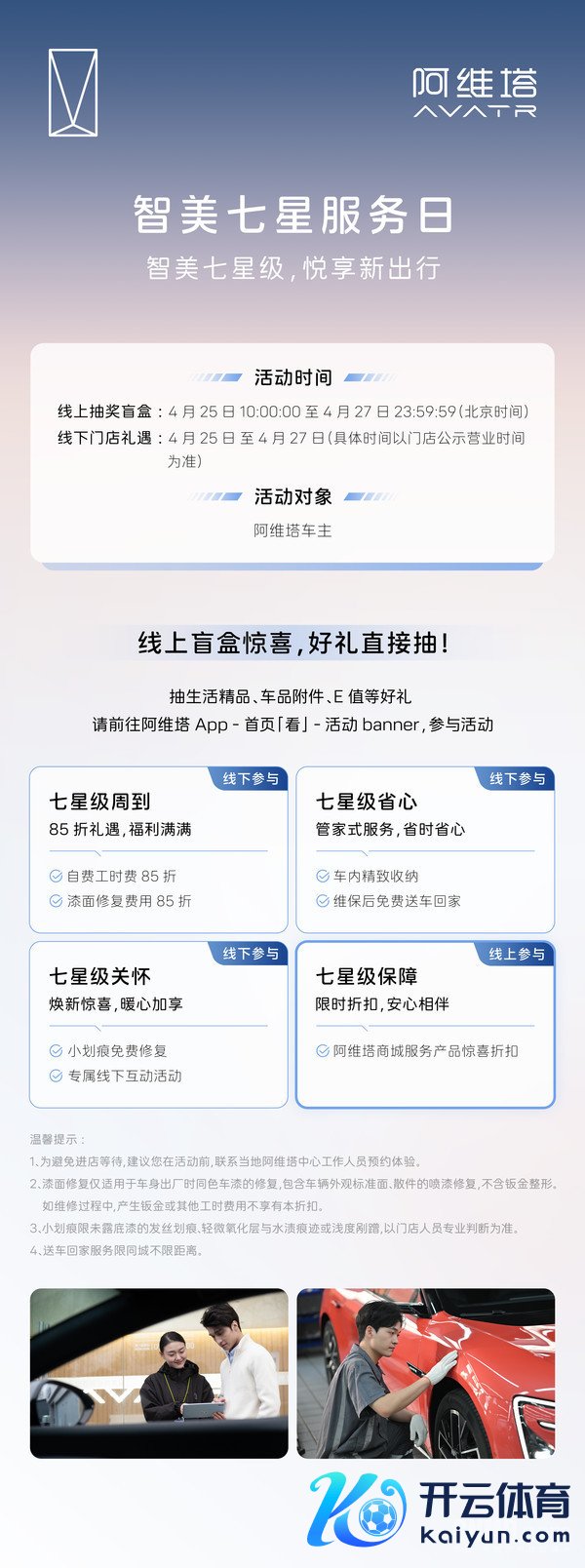 线下行径则将在各门店同步伸开。行径技术,阿维塔车主不错享受多项专属优惠和劳动。在“七星级玉成”中,车主可享受私费工时费85折、漆面缔造用度85折优惠;“七星级宽解”则包括车内精细收纳和维保后免费送车回家;“七星级关切”为小划痕免费缔造和专属线下互动行径。