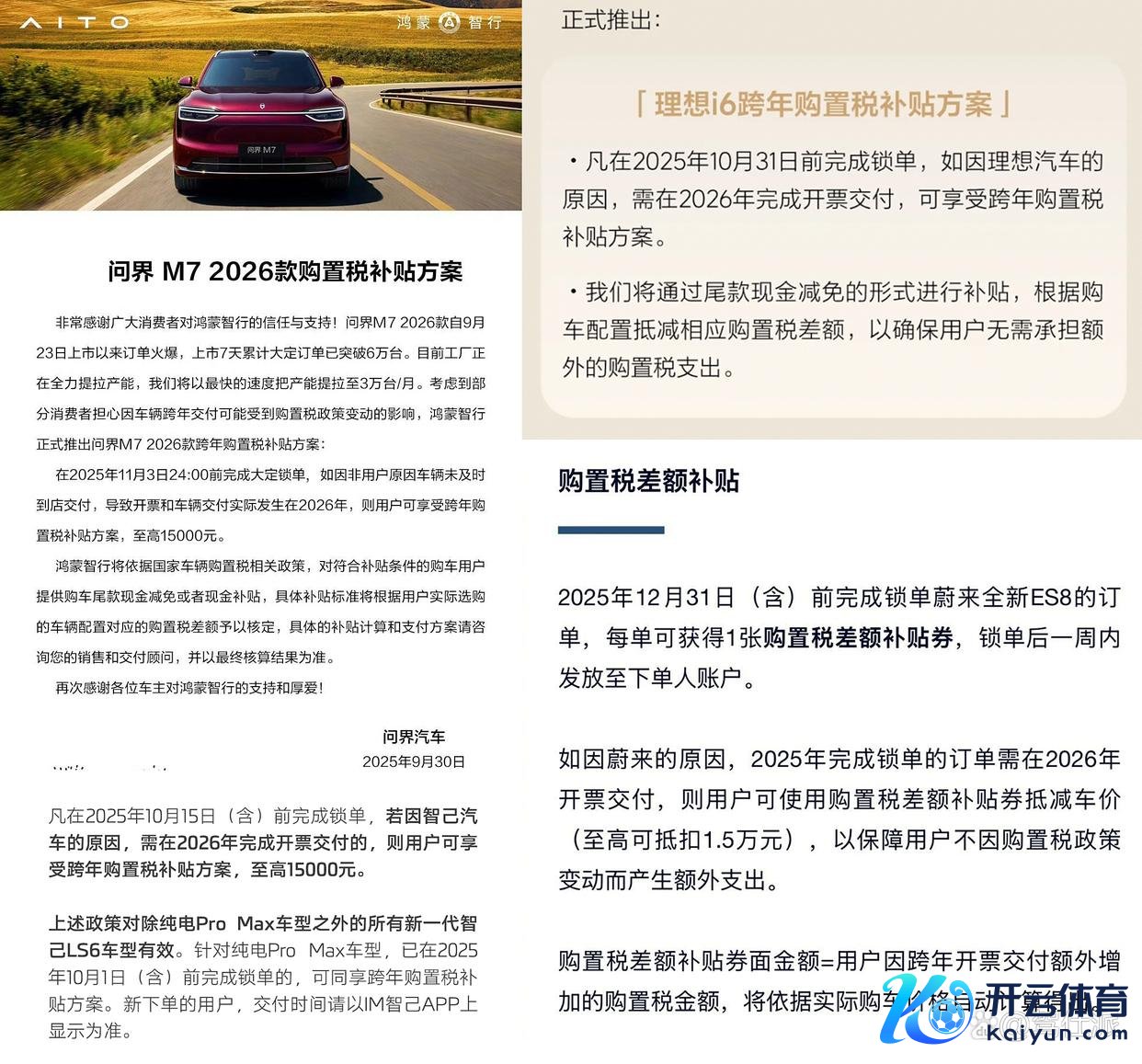 但需要详确的是,各品牌也为购置税兜底策略成立了不同的“锁单窗口期”。理思i6与极氪9X的松手日历为10月31日;问界M7定在11月3日;蔚来ES8的委派周期最长,因此松手时间也蔓延至12月31日;智己LS6的窗口期最为着急,除了纯电Pro Max版已于10月1日杀青,其余版块均于10月15日松手。这意味着,耗尽者若思享受购置税优惠,需在此日历前完成锁单,搭良策略的“末班车”。